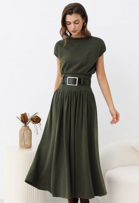 Gentle Knit Top and Belted High Waist Skirt Set in Army Green