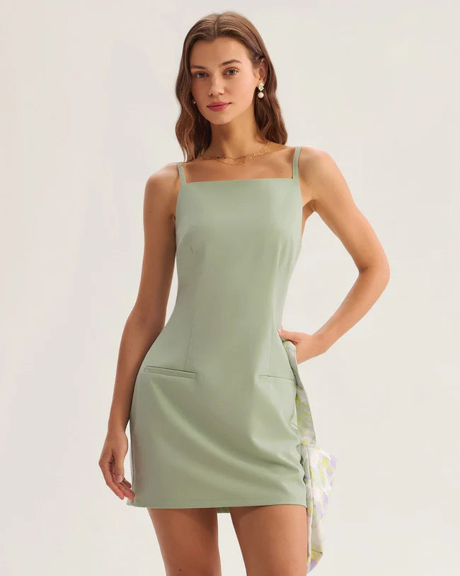Featuring a sleek square neckline and a flattering slip design, this mini dress offers a chic, minimalist look perfect for day or night. Its soft, lightweight fabric drapes beautifully, while the bold green hue adds a pop of color to your wardrobe.